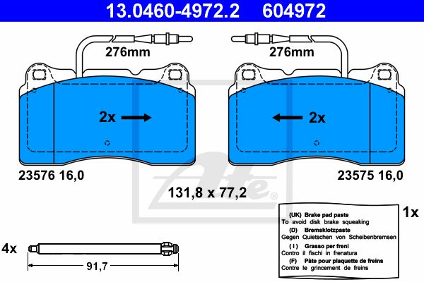 Комплект тормозных колодок, дисковый тормоз. ATE 13046049722